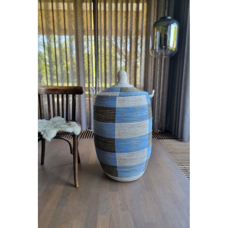 Een mooie afrikaanse wasmand met deksel handgemaakt in Senegal. De manden zijn gemaakt van zeegras met gerecycled plastic. Multifunctioneel te gebruiken als bijv. wasmand, speelgoedmand, dekenmand. OF gewoon als decoratie in de woonkamer.