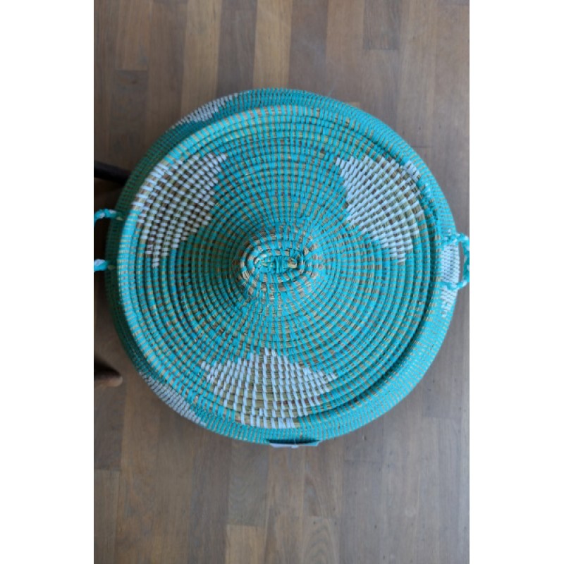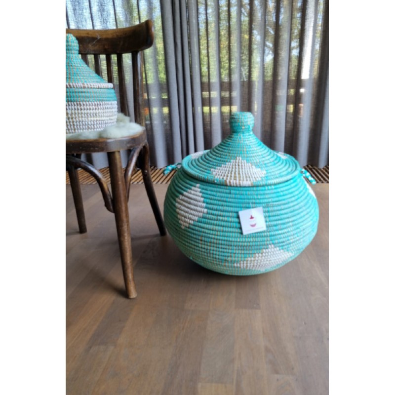 Een mooie fairtrade mand met deksel handgemaakt in Senegal. De manden zijn gemaakt van zeegras met zwart plastic. Multifunctioneel te gebruiken als bijv. speelgoedmand, dekenmand. OF gewoon als decoratie in de woonkamer.